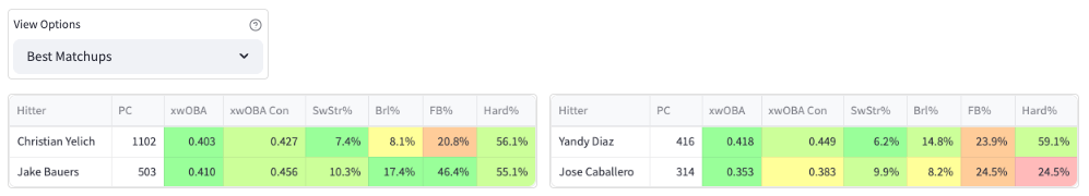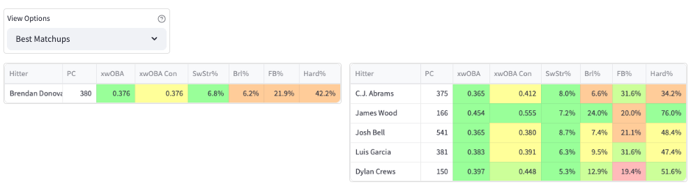 Both pitchers are decent with the xwOBA stuff. They don’t usually go out there and give up multiple homers or like 5+ earned runs. So it’s not the greatest spot in the world for stacking. But there are some standout hitter matchups showing: