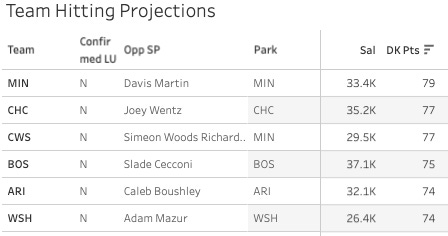 The model is loving the Twins in this spot against Davis Martin. They are projecting for the most fantasy points and the most runs scored in my model.