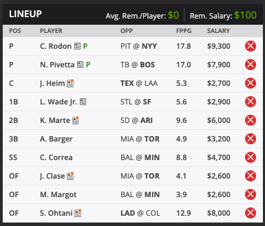 Jonatan Clase ($2,600) vs. Oller: Clase tore up the minor leagues, and let’s be honest - Oller isn’t much more than a minor league pitcher. He helps us get to Ohtani with this price at $2,600.
