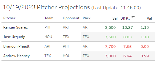 I want to be pretty thin with my DFS player pool here, and pitching is definitely a key to it. It’s been pretty evenly distributed on these four games slates, which has been surprising for me to see. I think it’s clear that Suarez and Urquidy have the best shots at double-digit points here. Pfaadt was pulled early in has last starting despite keeping the Dodgers off of the board for his 4+ innings with a 2-0 series lead. Now he gets the Phillies down 0-2, so I think there’s a very good chance he doesn’t even face Schwarber that second time. As for Heaney, if he’s pitching well he can probably get into the fifth, but I think the best bet if that he gets yanked after 2-3 innings for Dunning.