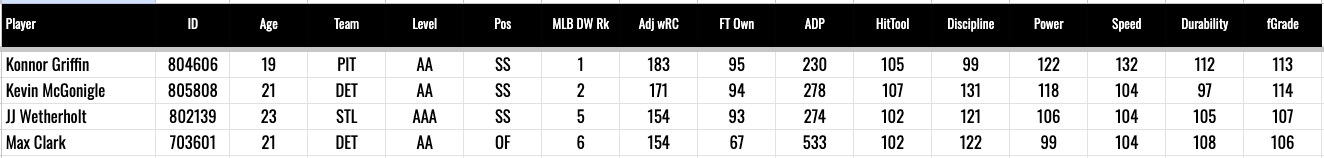 I’ve prepared a nice Google sheet of prospect data for my own use during this 30-team prospect draft we’re doing, and the paid subs can get their hands on it, too.