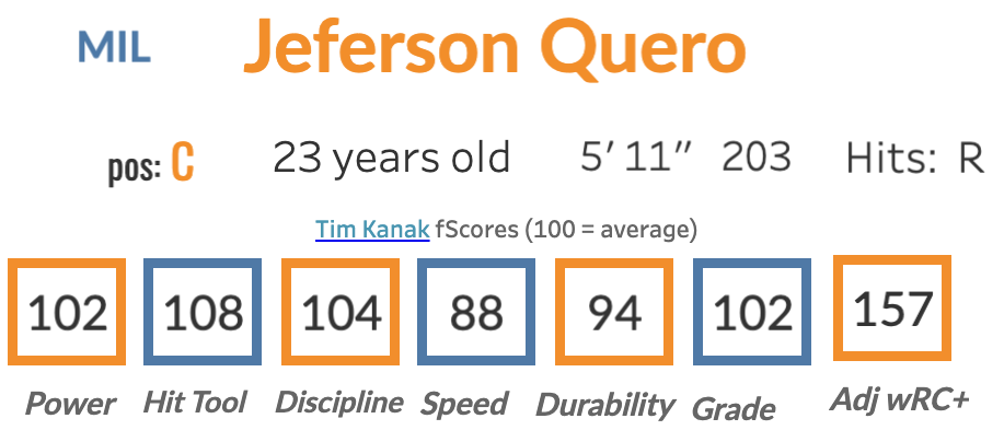 He seems like a Gabriel Moreno type to me. Good defense and some batting-average potential, with little raw power. Milwaukee’s park adds a couple of dingers, but the fPower being at 102 with just the 31 PA/HR in his minor league career makes me think he’ll be another ~15 homer catcher rather than being a guy who can bomb 25+.
