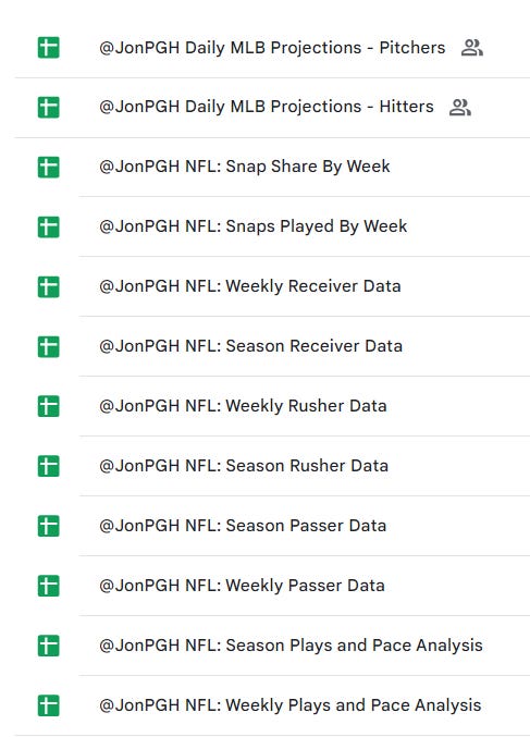 The 2022 dashboard will be much better than what you see there in 2021, I will integrate routes run, snaps, snap shares, target shares - all that stuff, right in with the other dashboards. We’ll also store DraftKings salaries and whatnot. I already have plenty of things with that current dashboard that I want to enhance and I know how to do it - but I just figured my time is better spent on other things right now and then we’ll really get that thing together once we have a week or two of NFL data.