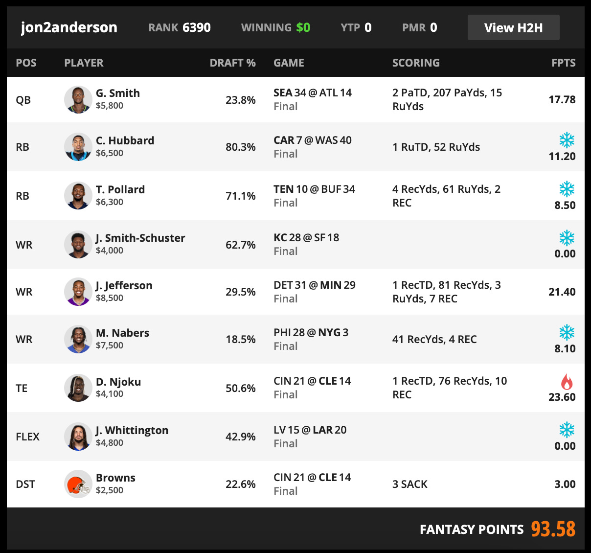 The Geno Smith play saved me from a total disaster, and I took 39% of head-to-heads to get a chunk of my investment back.
