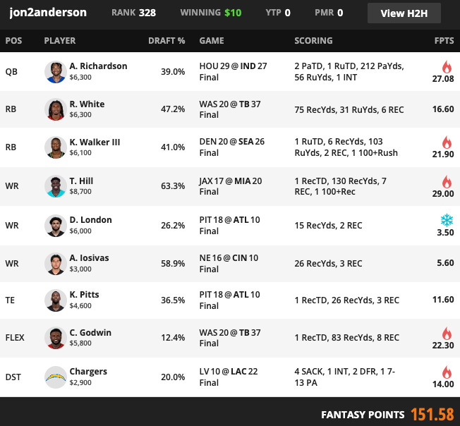 I wasn’t absolutely locked on to Drake London or Chris Godwin, but ended up with both of them. London was a bust, but Godwin was the second-best play on the lineup as he went for a big 22.3 points at just $5,800. I liked his floor, and loved that matchup with Washington’s bad defense. The Bucs scored 37 points, which made it pretty impossible for Godwin to not succeed - but luckily we were able to grab a touchdown for him.