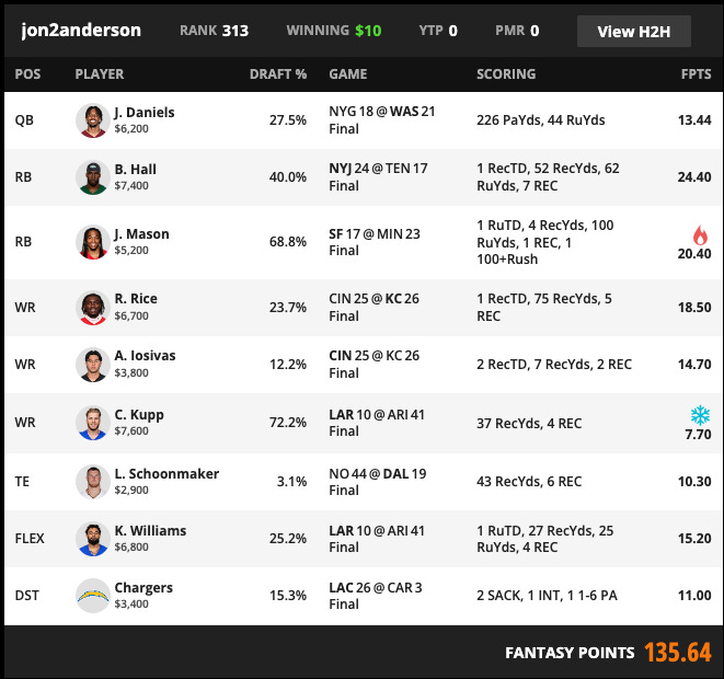 My #2 play was Jayden Daniels, and that’s where I finished. The price was right, the matchup was great, and I thought the floor was there. We pretty much got that floor results, as the Commanders did not score a touchdown, but he managed a non-awful 13.4 points. Not what I wanted, but fine.