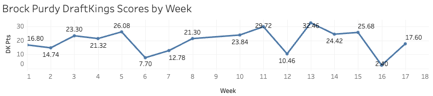 Brock Purdy ($9,200) is similar. The 49ers prefer to run the ball and take their time, and that limits Purdy’s fantasy scoring quite a bit. It’s not all bad news, though. The 49ers were the most efficient offense in the league last year, and that led to plenty of strong scores from Purdy.