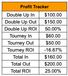 That puts me at a 25% ROI overall. Good start. I am starting to wonder if it’s a better idea to not do the tournament, but we’ll keep that going for this week and see where we’re at.