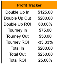 I didn’t get the analysis or lineup out last night. It’s tough for me to write on Sundays, but the lineup did cash in the double-up and fall short in the $15 tournament. We’re at a 25% ROI on the tracker now, but a nice 60% mark in double ups: