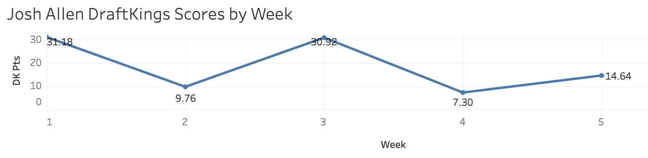 Aaron Rodgers ($9,000) is $2,000 cheaper than Allen, but much worse. He’s been under 20 fantasy points in four of his five games, and unlikely Allen does not have a 30+ point ceiling. He’s maxed out at 281 passing yards and 26 rushing yards, most often being under two rushing yards. The Bills have allowed the fourth-least yards per pass attempt in the league at 6.2. Rodgers is far from a must-play.
