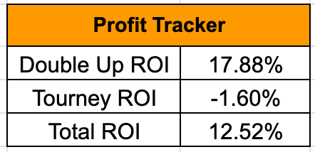 We lost it all on Thursday night and came down to a 12.5% ROI for the year, and we’re underwater in the tournaments.