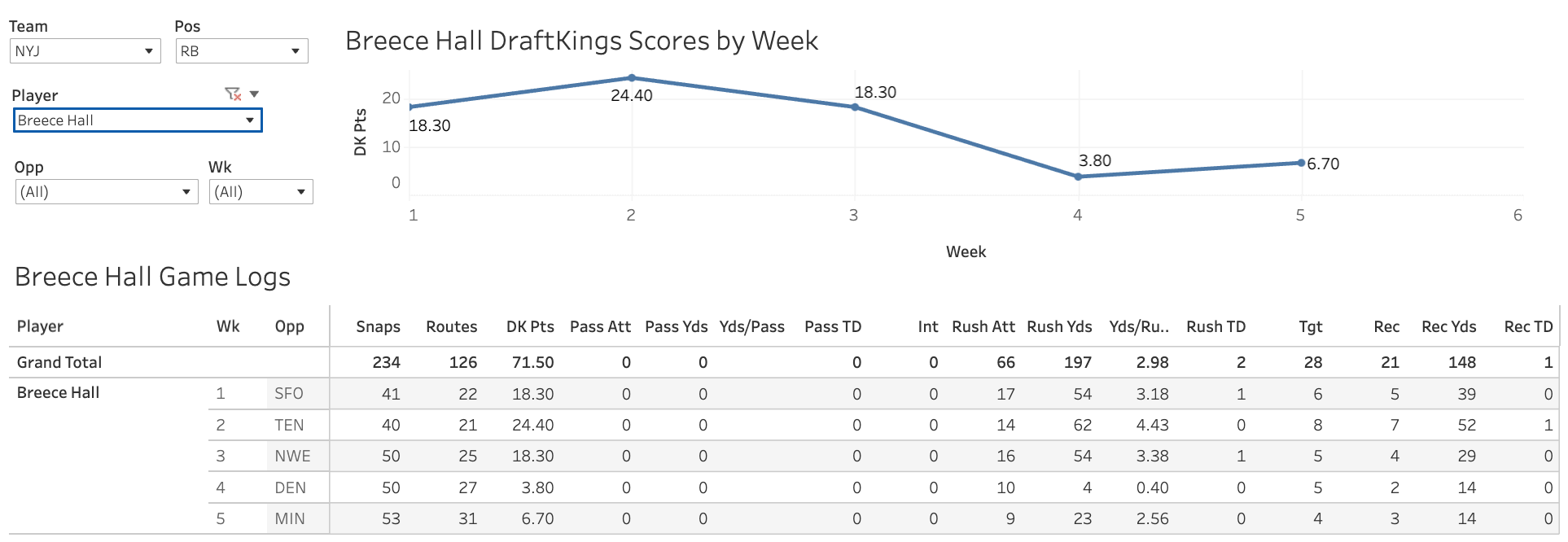 On the Buffalo side, it’s been James Cook ($10,200)’s backfield. He has 70 attempts, while nobody else has more than 26. The pass game roll hasn’t been great, but it’s not been awful either, with 11-123-1 in five games.