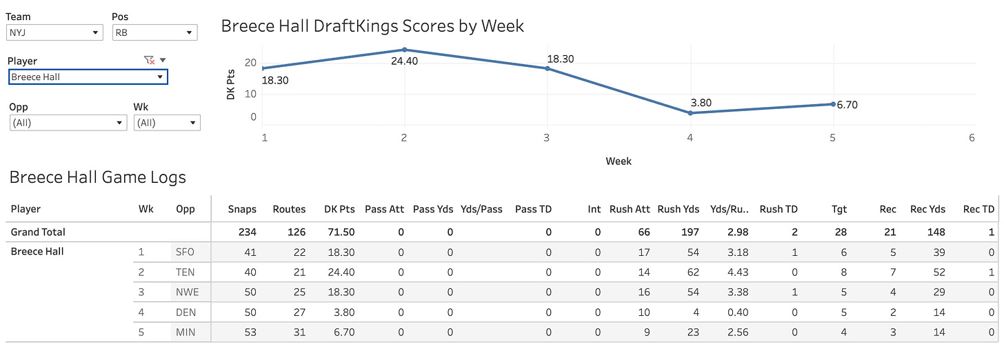 Breece Hall ($9,400) has scored 6.7 and 3.8 fantasy points in his last two games. Coming into this season, I would not have thought that possible in a two-game span where he did not get hurt. He’s averaged just 2.98 yards per carry this year and has exceeded 50 receiving yards just once.