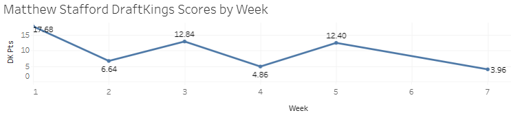 Any NFL QB should be expected to score more than ten points in a game, and it’s not as though Stafford is a truly poor quarterback at this point. There’s been a lot of bad luck in Stafford’s season, including a 1.51% TD%, which is second-lowest in the league (to Jacoby Brissett). I think we can take advantage of this low QB price and plug him in.