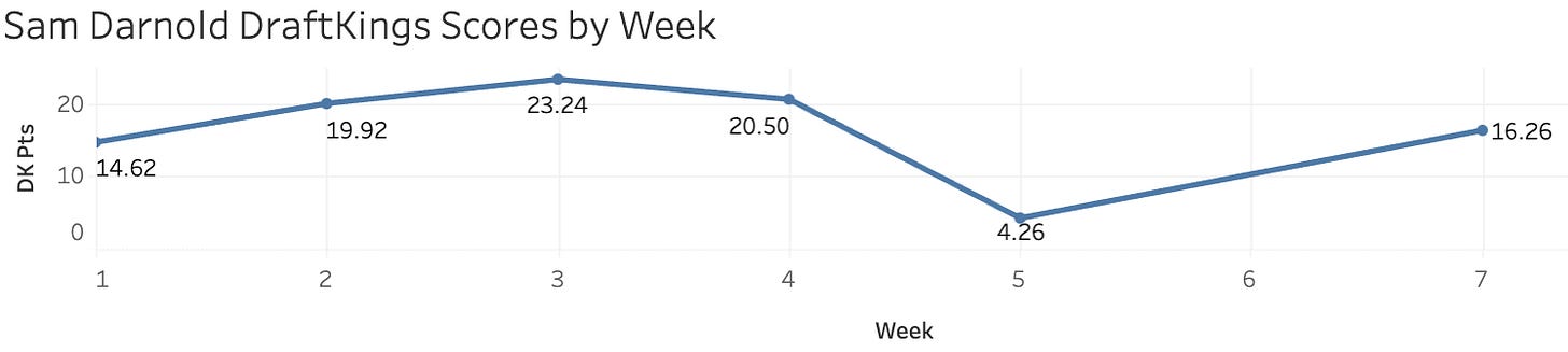 Sam Darnold ($9,400) is also affordable for a QB, and clearly the preferred play over Stafford. He's averaged 228 yards and two touchdowns per game. He has one very poor scoring game back in week five against the Jets: