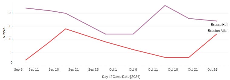 Breece Hall ($10,400) is the slate’s highest projected player. He did give up more work (including a touchdown) than he had been to Braelon Allen ($4,400) last week. But he’s the main guy, and he’s one of the best running backs in the league in terms of pass game involvement. I don’t think we can fade Hall in our single lineup tonight.