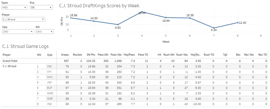 The Texans, as mentioned, are missing their top two receivers. That makes Tank Dell ($9,200) their main guy, with Dalton Schultz ($7,000) expecting an expanded role and Xavier Hutchinson ($4,000), John Metchie ($2,800), and Robert Woods ($3,000) competing for the rest of the targets. That’s a pretty tough group to project.