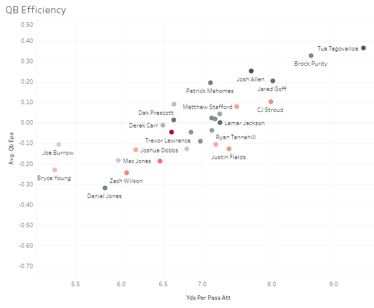 Convincing win for the Jaguars, but they were benefitted hugely by those four Minshew turnovers. On offense they had a bad 4.0 yards per play and Lawrence went for only 181 yards on 30 attempts (6.03 YPA).