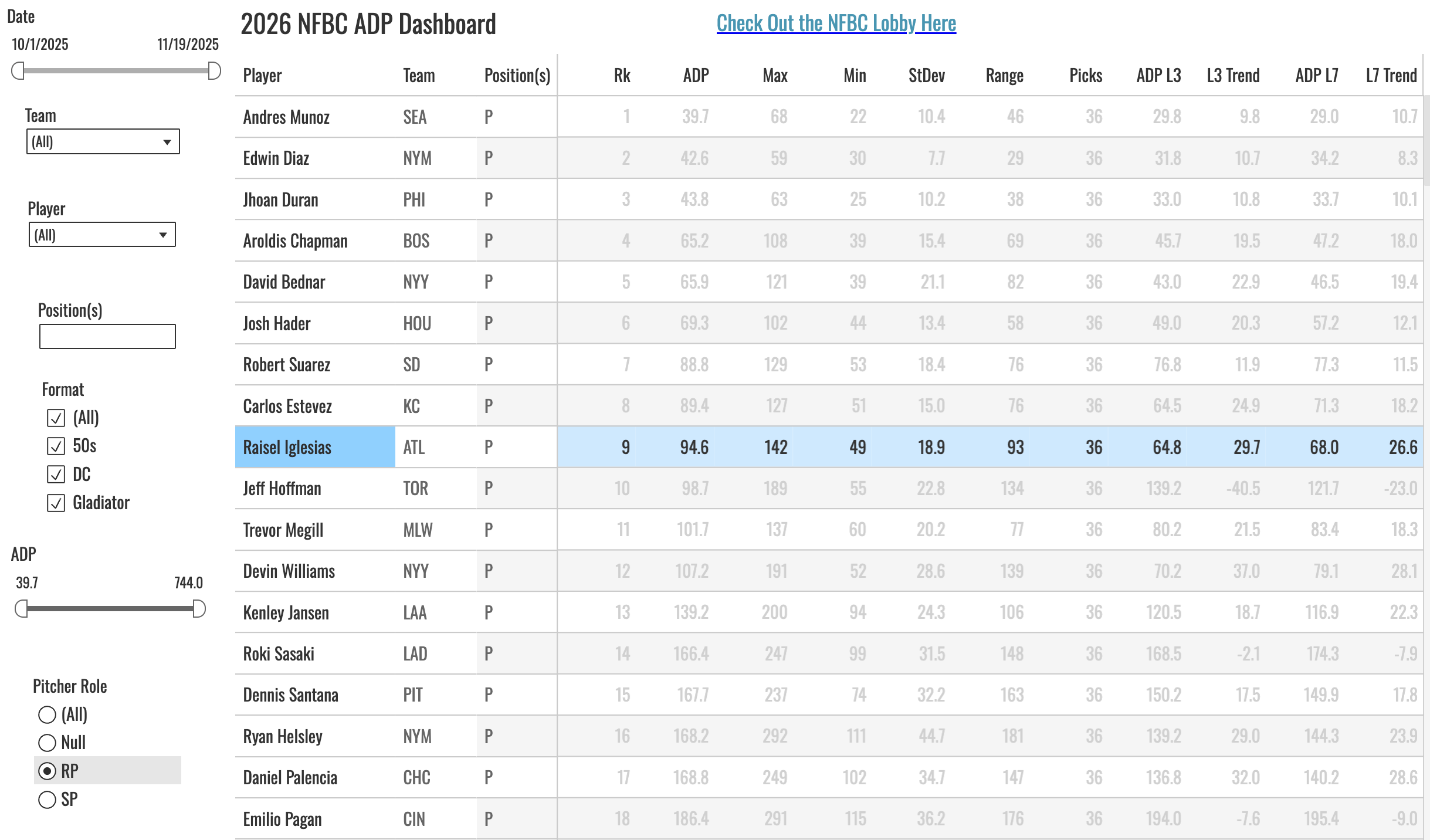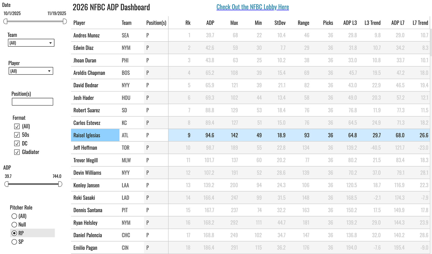 Some of that had to do with the down year in 2025. But mostly it was about the uncertainty of where he’d land. It was possible he’d end up on a team that wouldn’t use him as their main closer. Being back in Atlanta, there are no questions about him being the ninth-inning guy. This signing will push him up a few slots in the RP ranks going forward. You can track all of that on the NFBC ADP Analysis Dashboard.