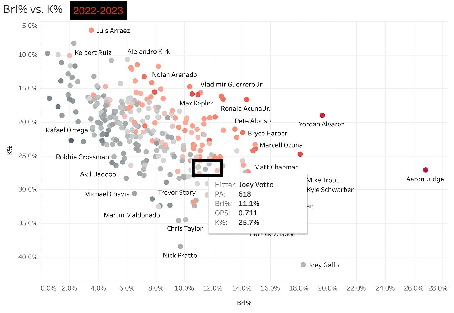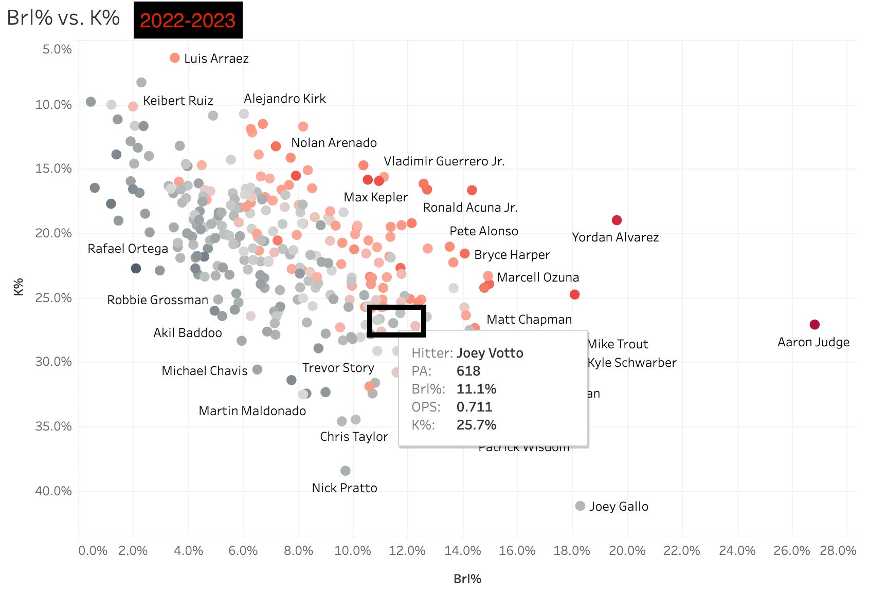 Great American Ballpark was a great situation for him to turn a lot of cheap pulled fly balls into homers, but clearly, there’s still a good amount of raw power here as shown by that 11% Brl% (league average is down at 8%. Last season, the home run rate for players between 10.5% and 11.5% Brl% was 24.5 PA/HR, good for around a 25-homer pace.