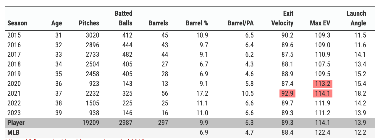 Heading into 2021, he clearly decided to sell out for power. His strikeouts ticked up, but so did his barrel, fly ball, and pull rates. It was a wise decision, and he put together a really impressive 2021 season at the age of 37.
