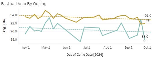 We have seen him losing a little bit of velocity this postseason. That’s still anchored by an early-season velocity bump that didn’t hold up. Here’s his fastball velo by outing from the regular season: