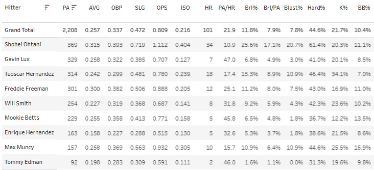Cole has his work cut out for him. Here are the regular season marks on the Dodgers’ lineup against the pitch types Cole throws (right-handed four-seamers, curveballs, cutters, and changeups):
