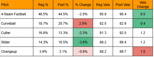 Let’s take a look at both pitchers for this game. Here’s the regular season vs. postseason pitch data for Gerrit Cole.