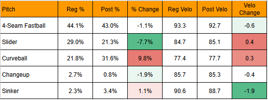 He has opted for the curveball more than the slider this postseason, basically reversing those two pitch usages. He also attacks righties and lefties similarly: