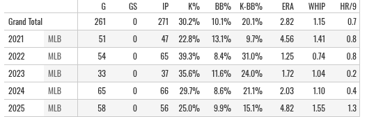 But 2025 was a different story. Helsley’s command disappeared, his strikeout rate dipped to 25.0%, and his home run rate spiked to 1.3 HR/9, leading to a 4.82 ERA—his worst full-season mark to date. His fScores tell the same story: elite raw stuff (114 fStuff) and durability (136 fDurability) remain intact, but his fControl (101) and fERA (106) signal a pitcher who must tighten up execution rather than overhaul his arsenal.