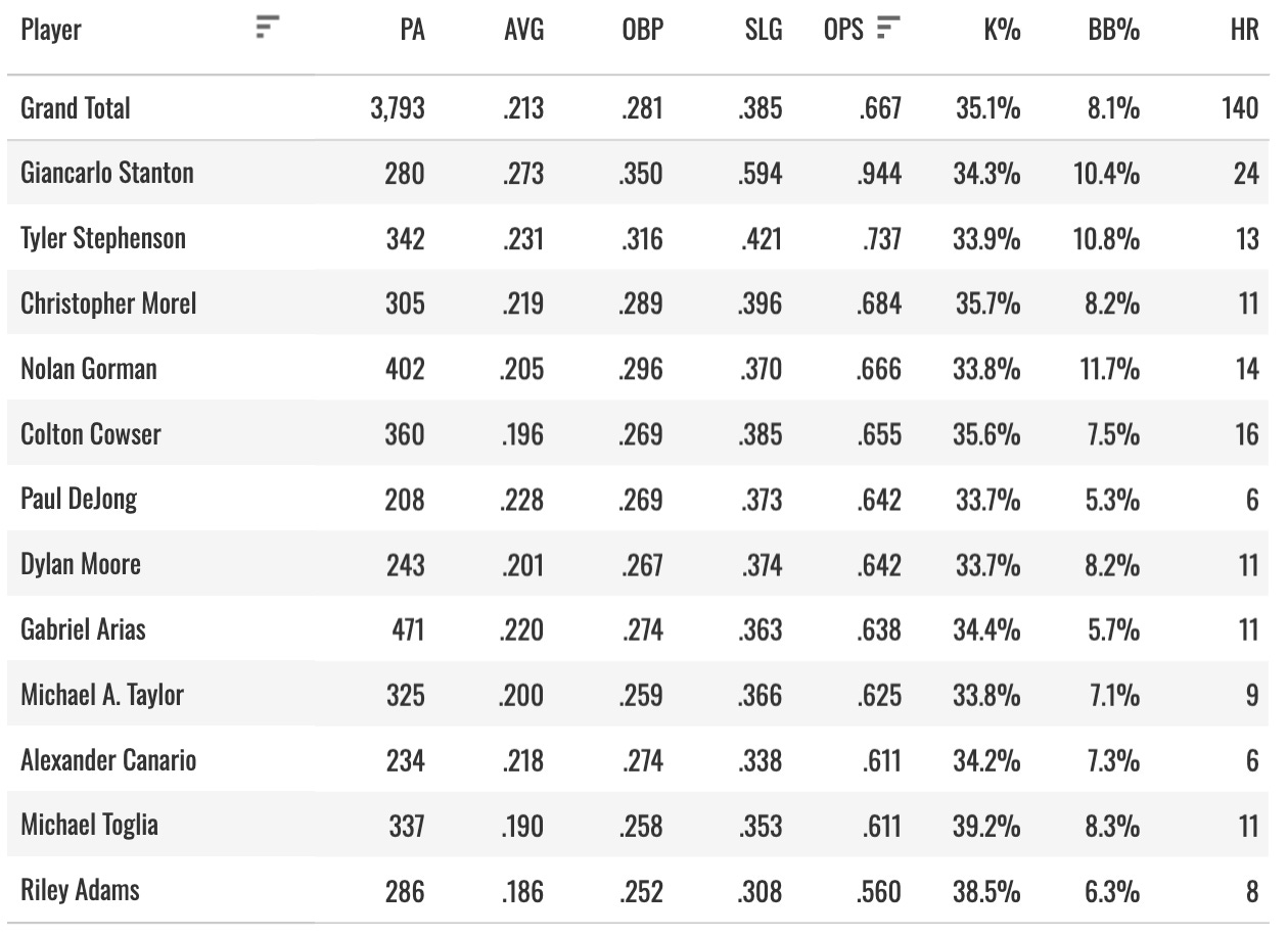 Only two hitters over a .700 OPS, and they were both in limited samples. The aggregate slash line of that group is .213/.281/.385. It’s tough to give that many PAs away and still do positive things with the bat.