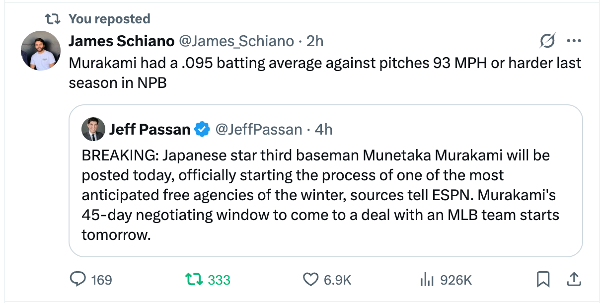 Munetaka Murakami has been POSTED. It’s a trend! We’ve seen impact players coming over from Japan and Korea for several years in a row now. Seiya Suzuki, Ha-Seong Kim, Yoshinobu Yamamoto, and Roki Sasaki are the big ones. But there’s a slew of other role players who have made a difference to their newfound MLB organizations (Hyeseong Kim, Masataka Yoshida, and I’m sure I’m missing a bunch!).