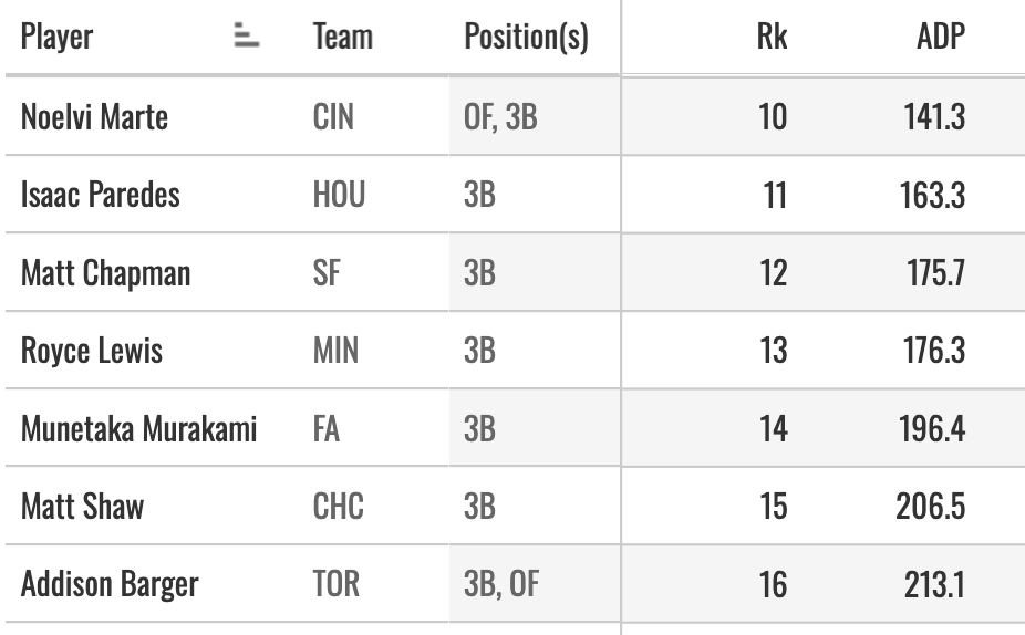 That will probably shoot UP (meaning down… meaning he’ll go earlier in drafts) after he lands on a team. That seems to be how it works. Even at ADP 200, I don’t think that’s right. Some of the other 3B around that range: