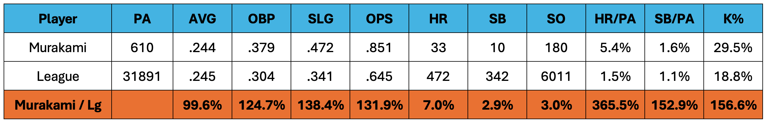 You see a 33-homer season and you don’t exactly fall out of your chair. We have big boys hitting 50+ yearly now. But Murakami’s 33 is a massive number in that league context. The Major League home run rate was 3.1% last year. That’s double Japan. Take Murakami’s rate and translate it to the Majors and you have a home run pace well over 60. Basically just double his 33, right? 66 bombs!