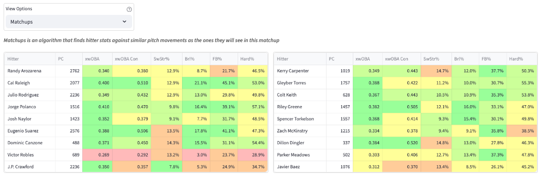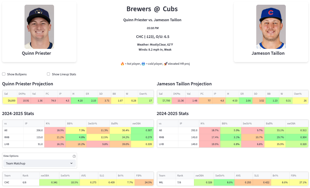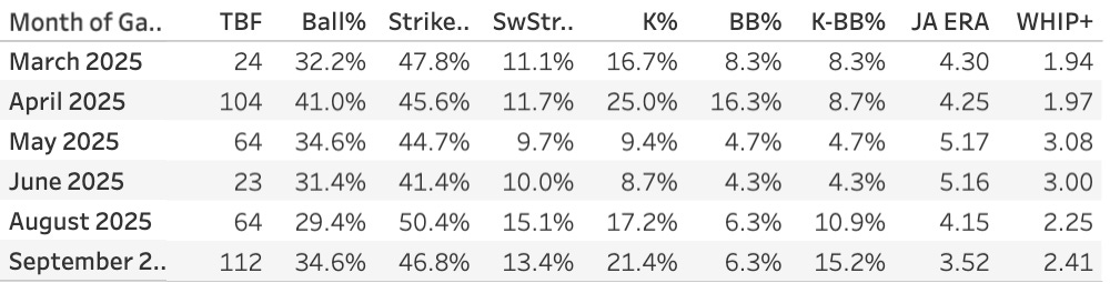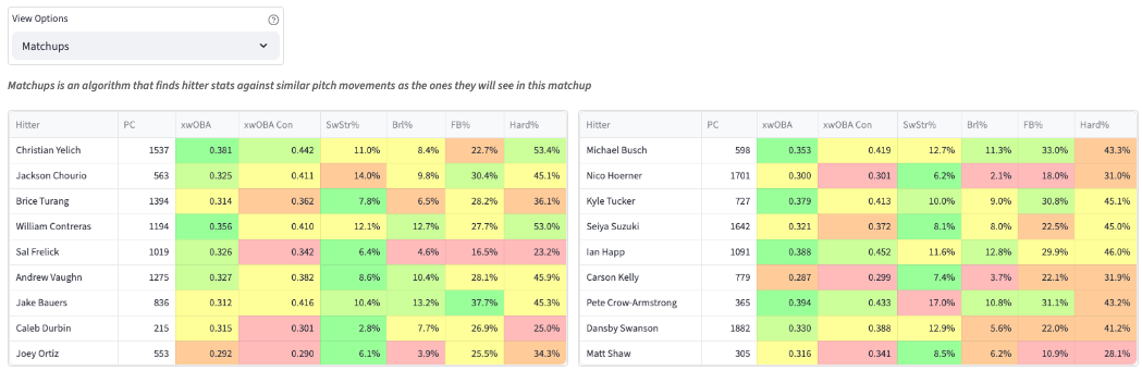 He was about league average by the summary stats (JA ERA & WHIP+). But he was still a below-average strikeout pitcher. The heavy sinker generated a 65% GB%. That’s a really nice weapon to have. Being able to reliably keep the ball in the yard goes a long way, and that’s what we saw with Priester. He used the slider as the putaway pitch against righties (19.3% SwStr%, .265 xwOBA allowed). And due to that, he faired a bit better against them in the K% department (21.1% to righties, 19.1% to lefties). He relied more heavily on the cutter when facing lefties, and that isn’t a great pitch. The 10.4% SwStr% and 39% Ball% he posted against lefties are no good. I think he’ll continue to struggle in those spots. Kyle Tucker, Michael Busch, and Pete Crow-Armstrong are in good spots here.