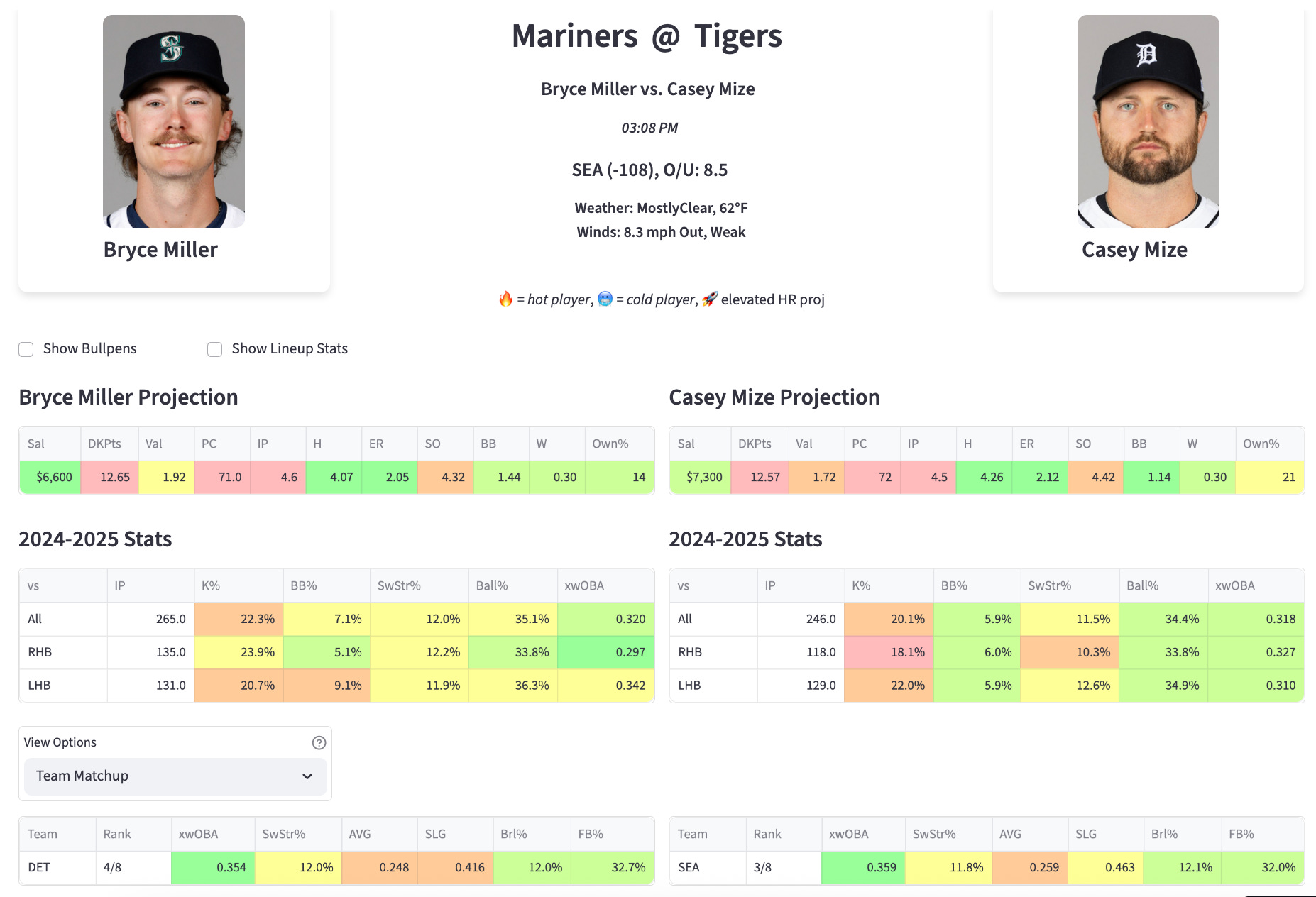 But I think this guy is getting overlooked. The numbers on the year are so bad, and so much of that is because he did not have the fastball early on. And a lot of that could have had to do with a lack of health. So I’ll be sinking some funds into Miller next year. Why not start tonight? I like him in this matchup with the Tigers.