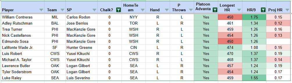 We’ll get rid of the chalk, and then we’ll also take out hitters facing pitchers who are extremely hard to homer off of us, just to narrow it down even more. We have a handful of elite home run suppressors pitching tomorrow. That does not mean that they can’t give up a long bomb, and bullpens will be covering half of the games tomorrow, but it still makes sense to get a manageable list to choose from. Here’s a list: