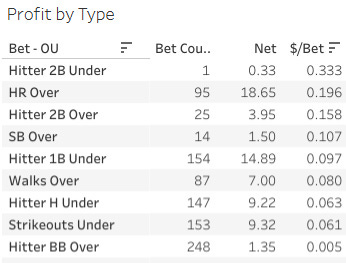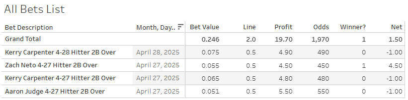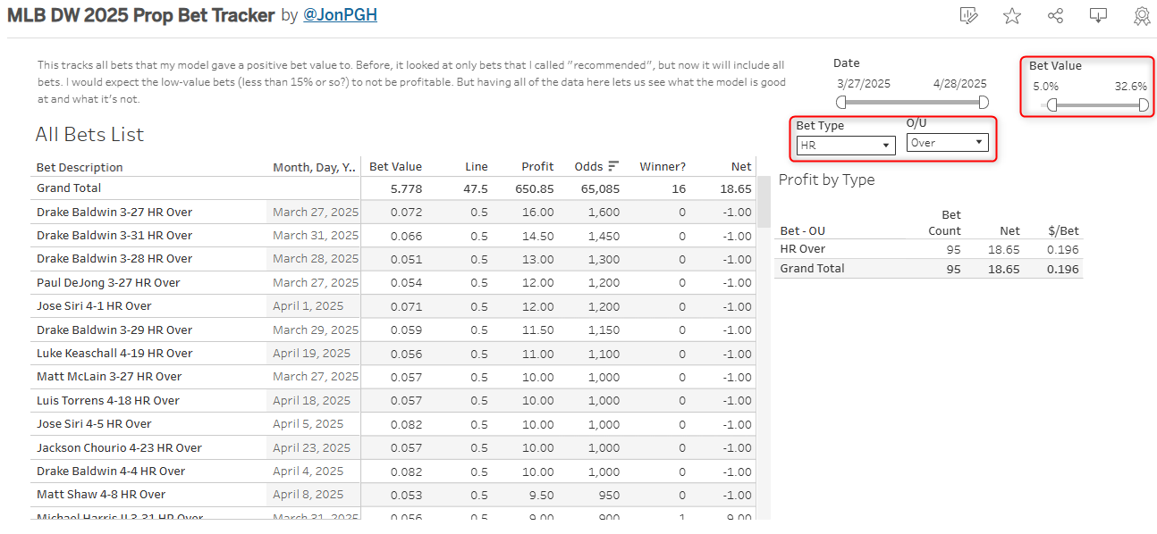 That’s how the tracker works. Will the “over homers” bets stay at a 19% ROI? I kind of doubt it! I’m personally pretty shocked to see any home run doing well. Those lines are usually absolute traps, but maybe we’re catching them on some mispricing, or maybe my model is actually just better than theirs! Who knows. What you certainly shouldn’t do is start betting money you can’t afford to lose on any of this stuff!