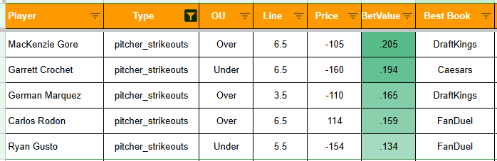 Last one before I go. The most fun and popular pitching prop is clearly strikeouts. And my model has been good on those.