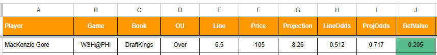 My model thinks there’s a 72% chance of Gore striking out at least seven Phillies today. The -105 price that DraftKings is giving us implies a 51% chance. So the gap between those two numbers is 21% (20.5% to be particular). That number is what the “bet value” is.