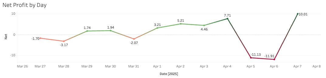 Things were pretty even for a while there, but the last four days have been outliers. We went +7 on Friday, -11 on Saturday, -11 on Sunday, and then +10 on Monday.