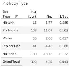 I’m not surprised to see pitcher hits lines not doing well. My model has a tough time with those. I’ve been trying to improve it, but I think at some level it needs a deeper overhaul. If you take out those two bet types, we’re at a 12.2% ROI. When you raise the bet value threshold to 15%: