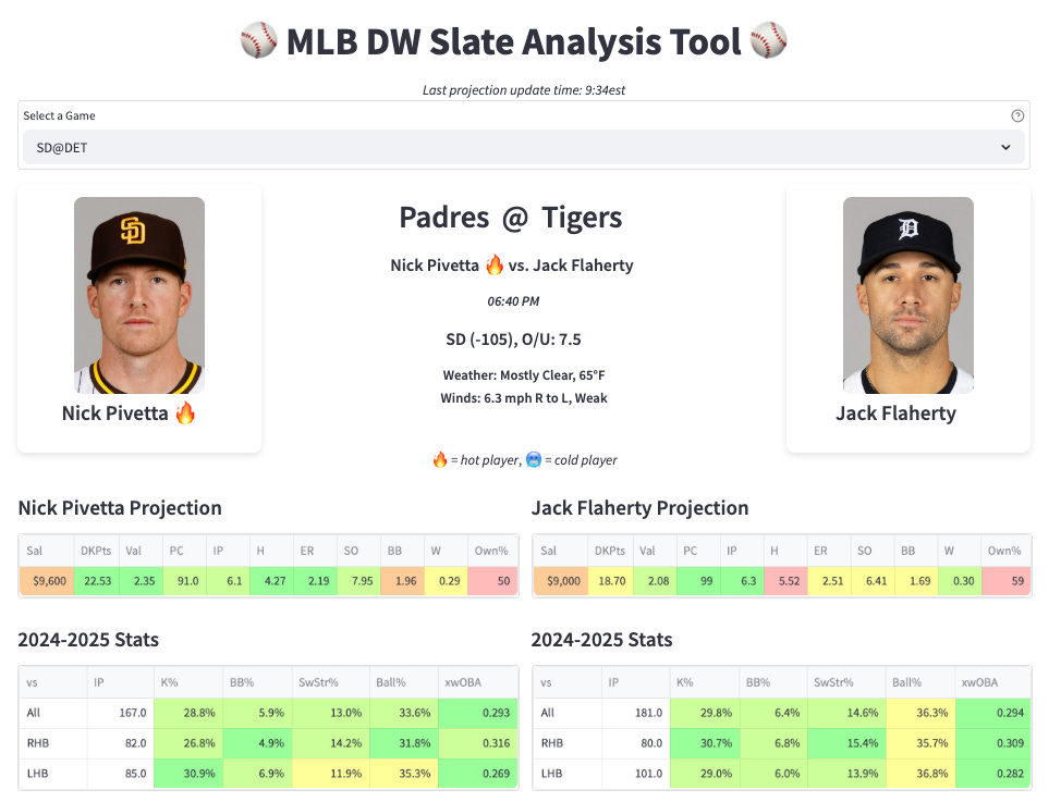 The season ROI on pitcher strikeouts props above a 15% value is +18%, and +23% when it’s an “over”. Pivetta has himself the fire emoji on the slate analysis tool, and the projection is at 7.95 strikeouts.