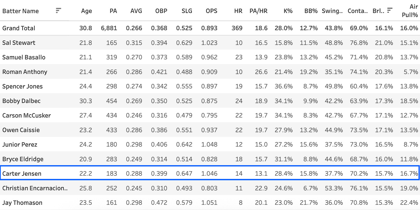 We’re likely to see a mid-20s K% or higher next year, and that could send him into some slumps that he’ll have to battle through. But the power is for real, and he’s been a double-digit steals guy in each of the last three seasons to boot. There’s a lot to like in Jensen right now, and he could prove to be a huge value at the catcher position in 2026 drafts if he makes the team out of camp. There’s no guarantee on that, of course, but he’s got a path to it.