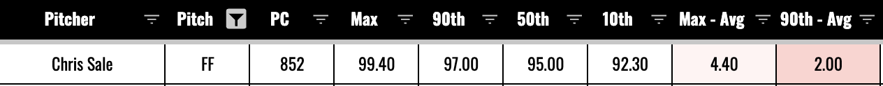 The largest gap goes to Chris Sale. He averaged 95.0mph, reached as high at 99.4mph, and the 90th percentile came in at 97.0mph. So he was really spreading it out, and probably taking it pretty easy with most of his fastballs.