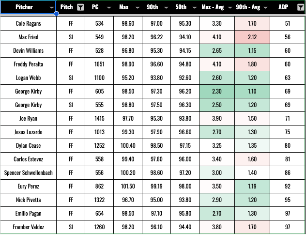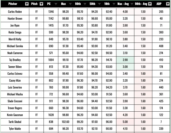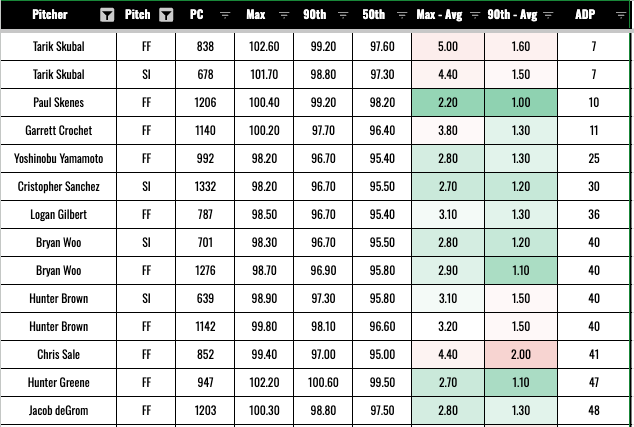 Here are your fantasy-relevant SPs for 2026 with the biggest gaps between their top-level velo and their average. And right off the bat, we see Carlos Rodon, who is currently recovering from elbow surgery. Just in case you needed another reason not blindly trust this stuff.
