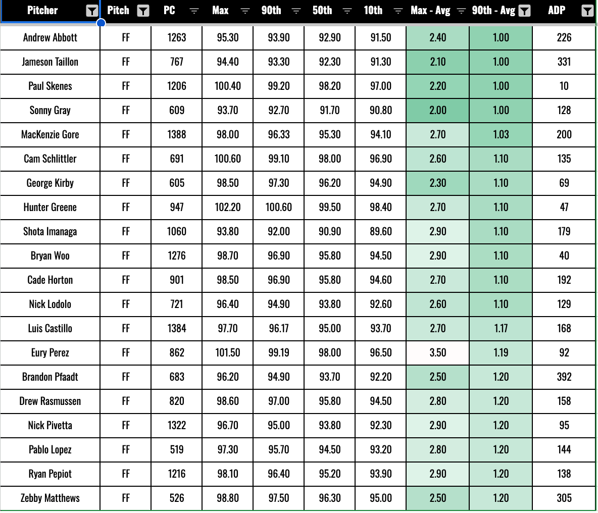 Andrew Abbott, Jameson Taillon and Paul Skenes! Oh boy, we don’t like to see the Skenesinator popping up here. His max effort is around 100.4mph, and his average was just a bit below that at 98.2.