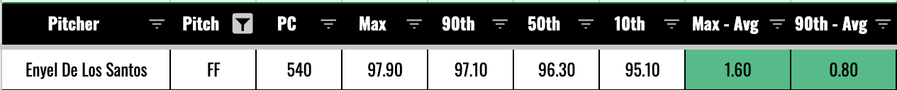 The smallest gap belonged to Enyel De Los Santos. His 90th percentile fastball velo was 97.1. That was just 0.8mph above his average of 96.3.