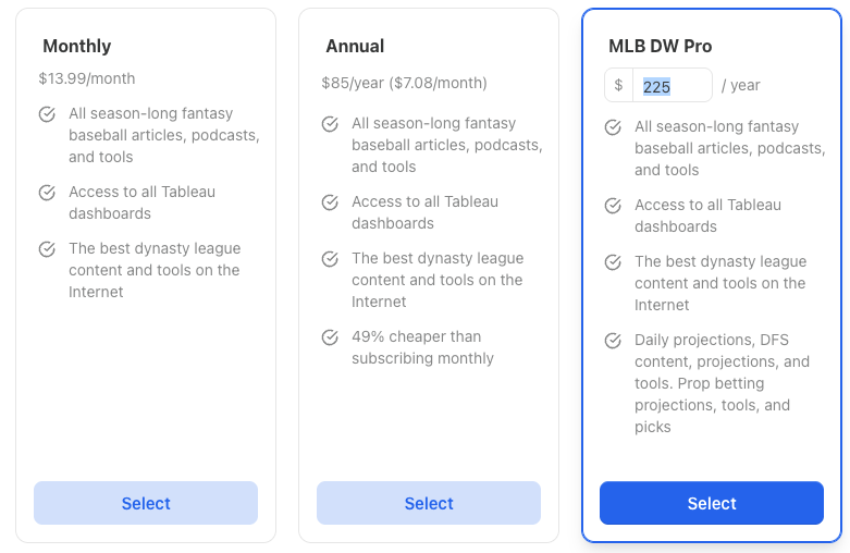 This is $13.99/month or $85/year. That $85/year is probably the best deal I offer, and I’m going to keep it there. You’ll get everything other than the content and tools that spin off the daily projections. So you won’t get any help with betting or DFS. Basically, that’s it. So if you’re not a DFS or betting person, you’re fine without MLB DW Pro.