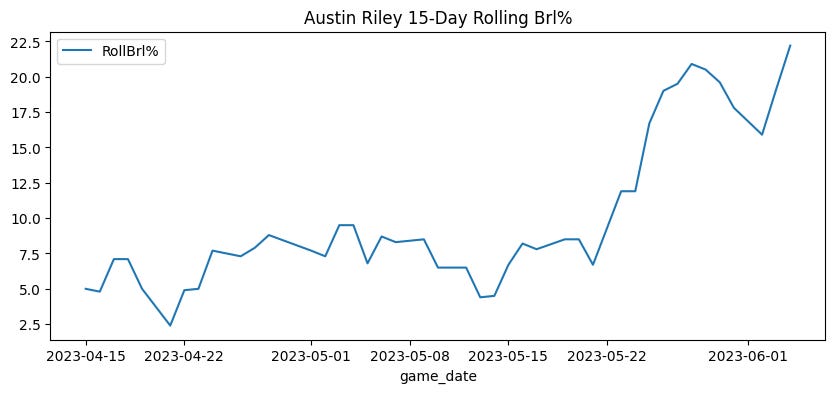 So for the first 15 days of the season, Riley had about a 5% Brl%. In late May, he started hitting more barrels, raising that 15-day rolling mark every day for awhile. Now he’s reached his peak at 22.2%, so you’ll see that shown below.
